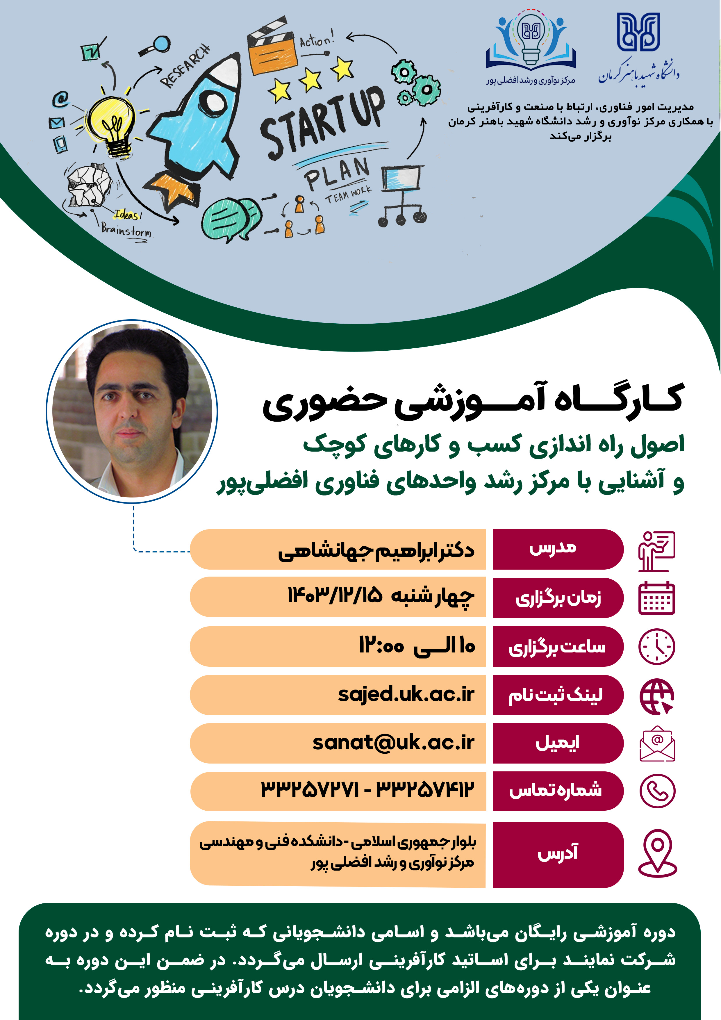 کارگاه آموزشی حضوری اصول راه اندازی کسب و کارهای کوچک و آشنایی با مرکز رشد واحدهای فناوری افضلی پور